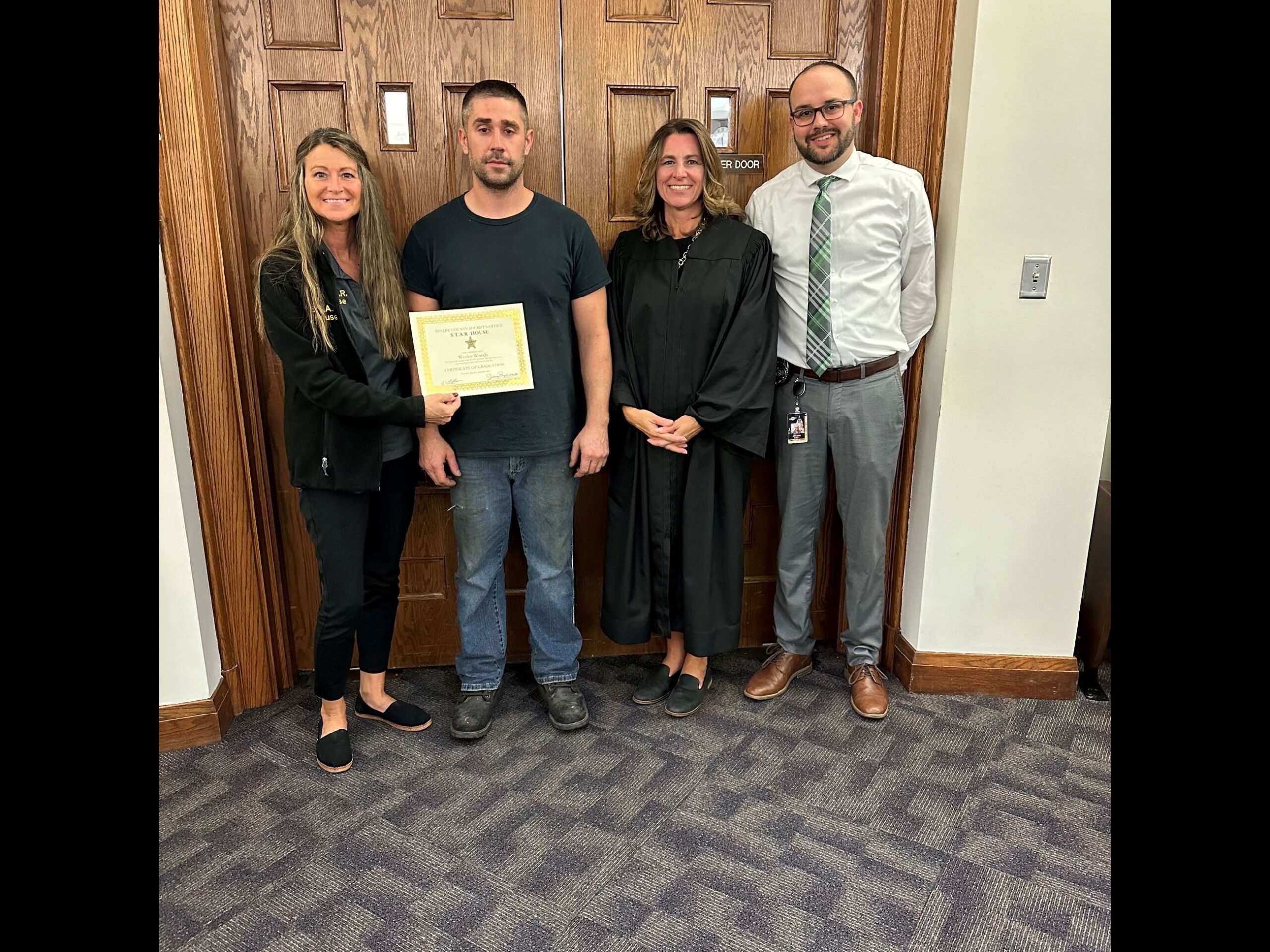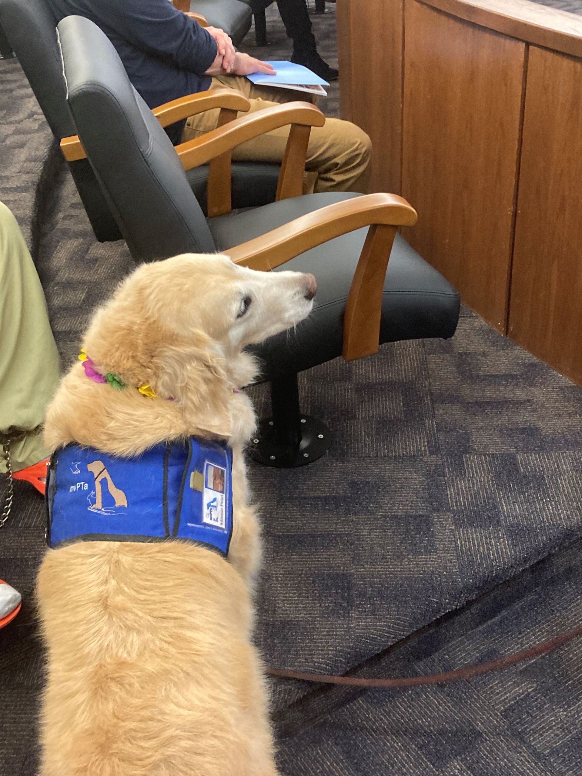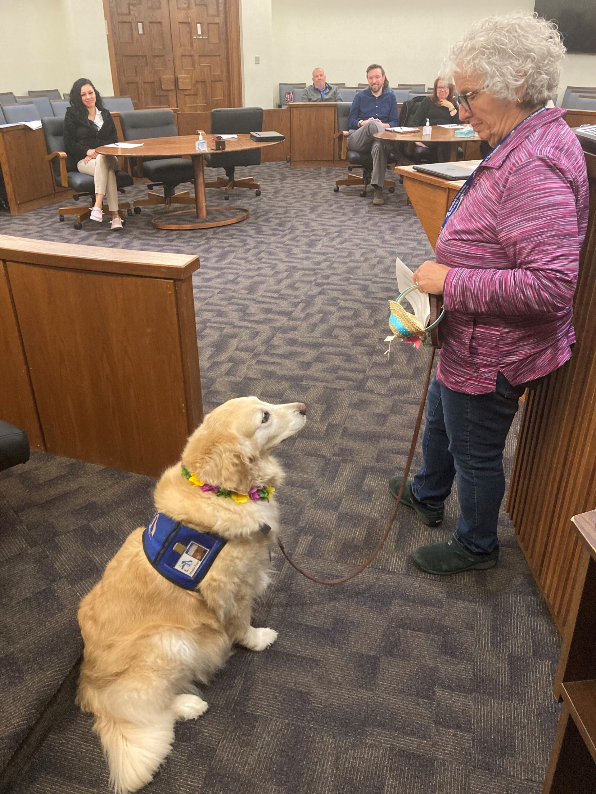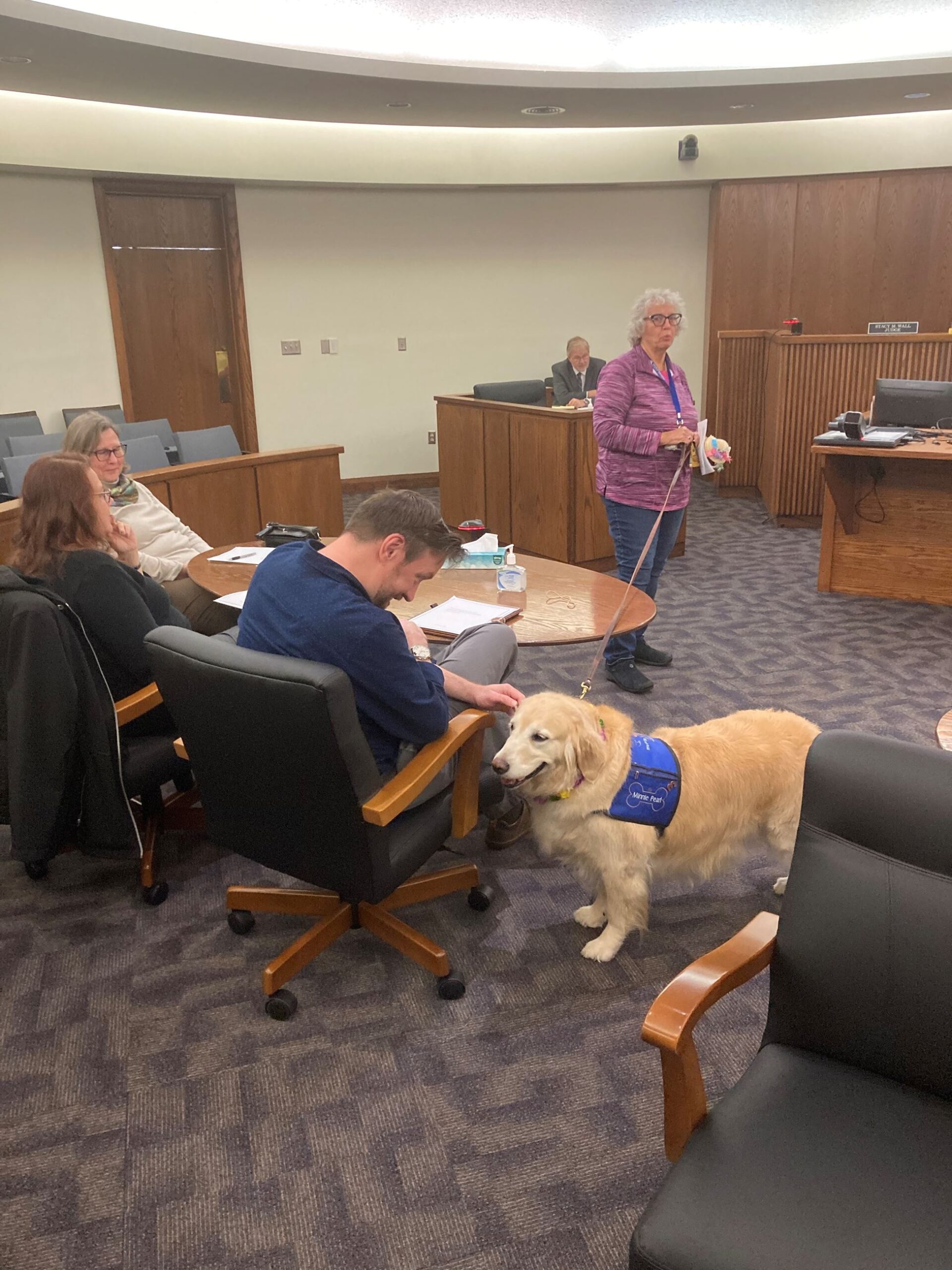 Judge Wall seeks to be creative in showing participants in the Mental Health Court alternative methods of therapy or coping skills. Pet therapy was introduced as “Minnie Pearl” visited the Court. She and her owner are members of the Miami Valley Pet Therapy Association.